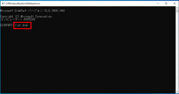 開いた画面で「list disk」(単語の間に半角スペースをあけます)と入力して